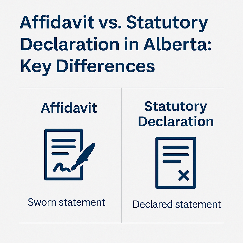 If you have ever been asked to sign a document before a notary or commissioner for oaths, you may have encountered the terms affidavit and statutory declaration. Although these documents appear similar, they serve distinct purposes under Alberta law and are used in different legal contexts.