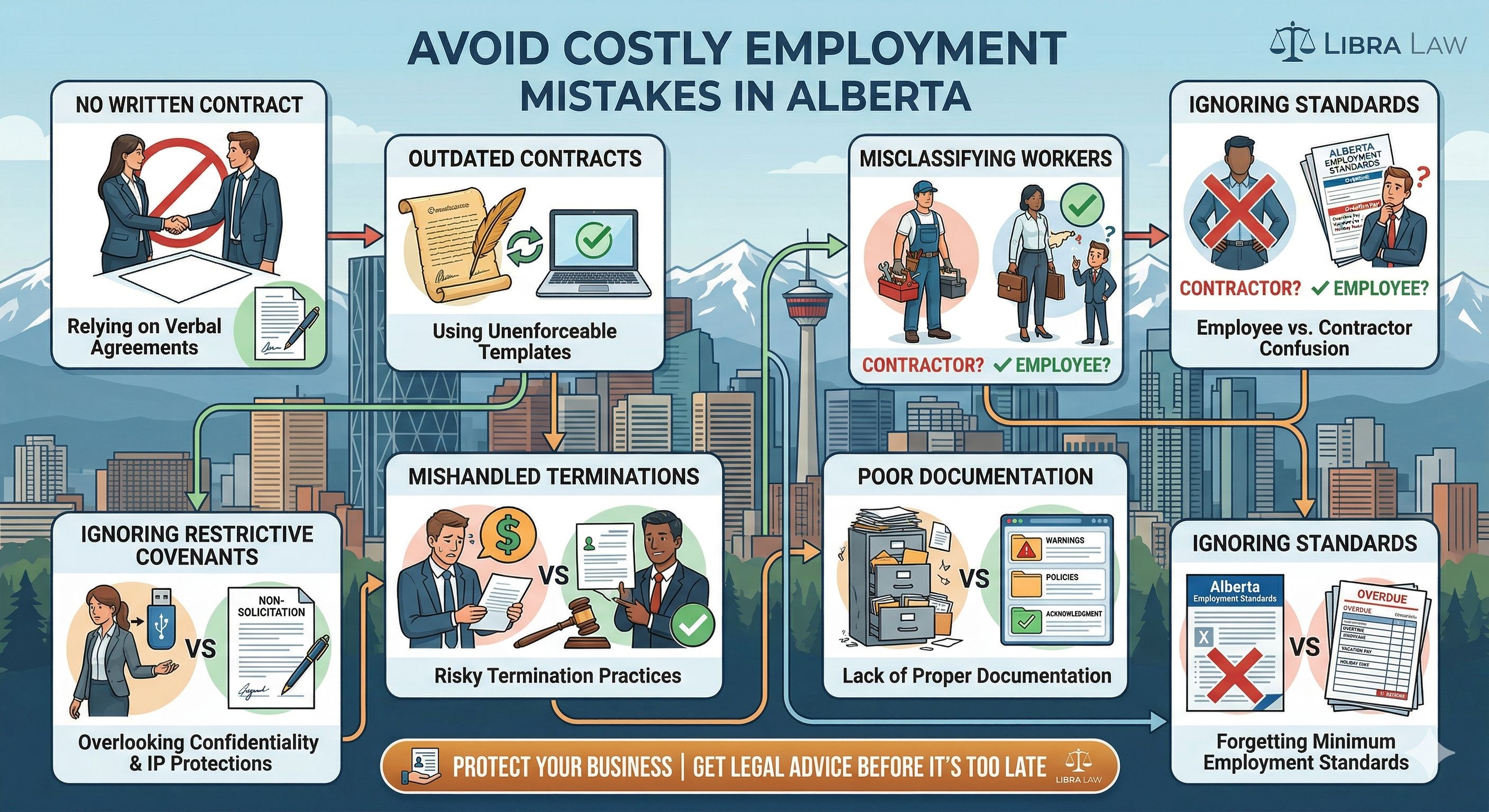 To learn more, read why written contracts for small business in Alberta matter and explore Libra Law’s Alberta employment law services.